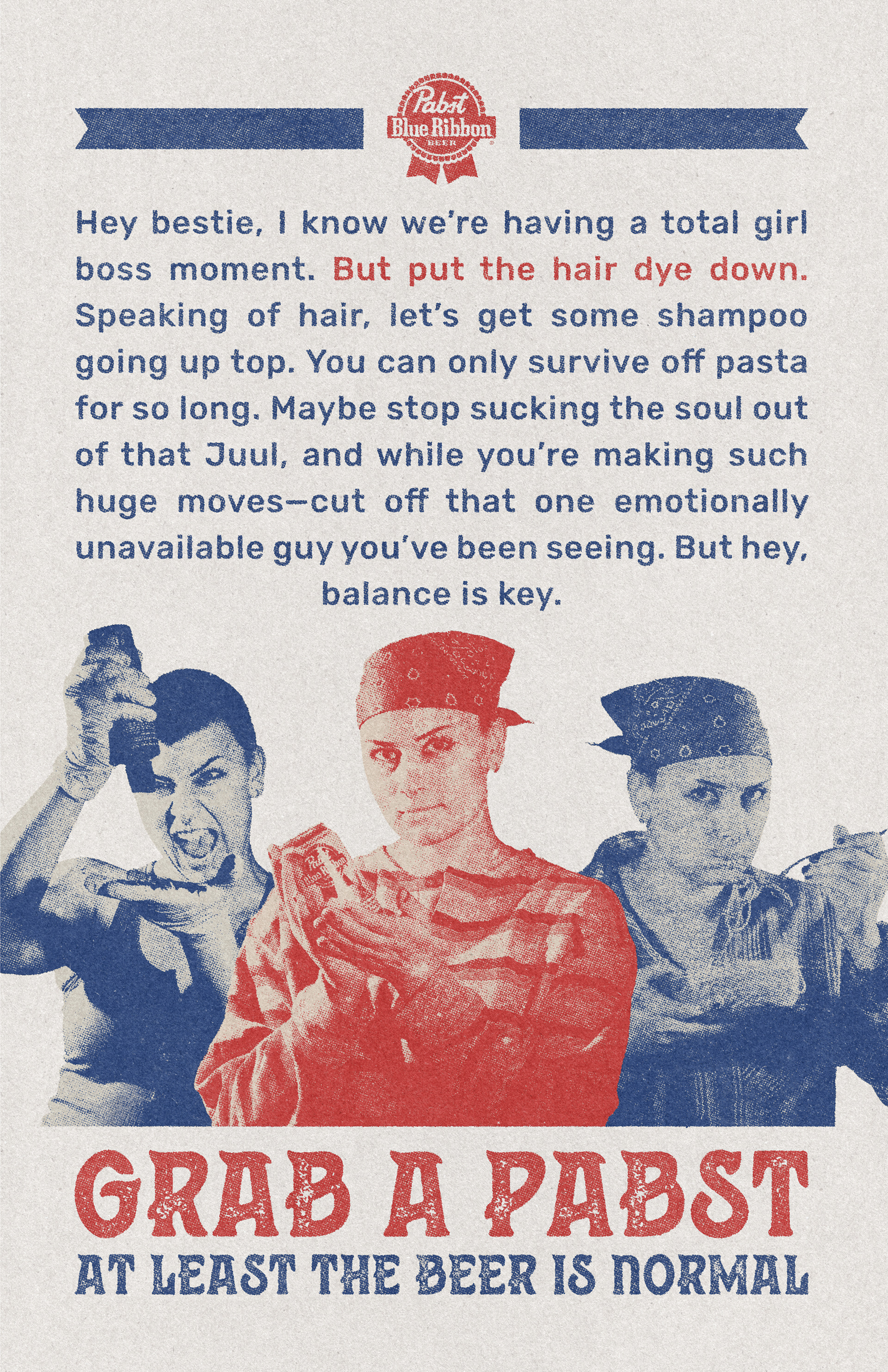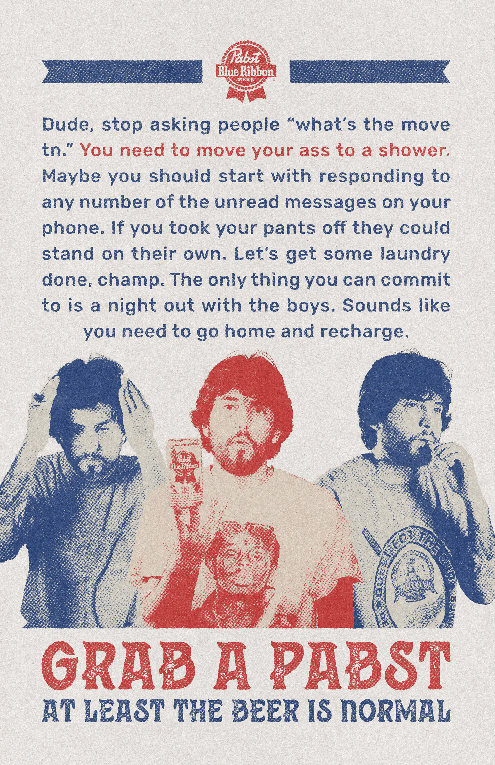 A copy driven Pabst Blue Ribbon campaign that focuses in on an artsy and slightly crusty demographic. These 21-23 year olds are unapologetic and unique, but the beer they continue to go back to is completely normal. The irony of this insight gave us the idea of normal beer for weird people.